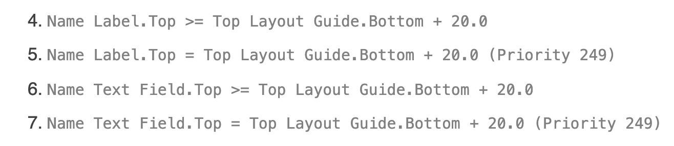NameLabel이나 NameTextField는 Top에서 최소 20만큼은 떨어져있어야하고 둘은 baseline이 같아야 합니다. 둘 중에서 하나의 폰트 크기가 커진다면, 다른 하나의 Top Constraint는 20보다 커져야 합니다. 그 반대의 경우도 마찬가지입니다. 따라서 아래의 제약조건들을 추가해주면 됩니다.