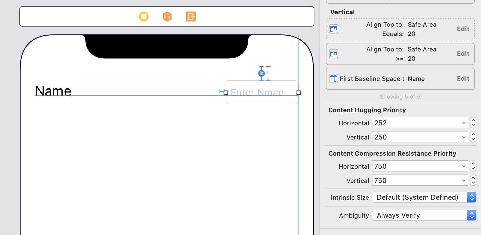 여기서 잠깐 질문이 들 수 있어요. 3번과 같이 NameLabel과 NameTextField를 이어줬을 뿐인데 왜 NameTextField는 저렇게 width가 길까?! 그건 textfield의 Hugging Priority는 250, label은 251로 우선순위가 낮기 때문입니다.