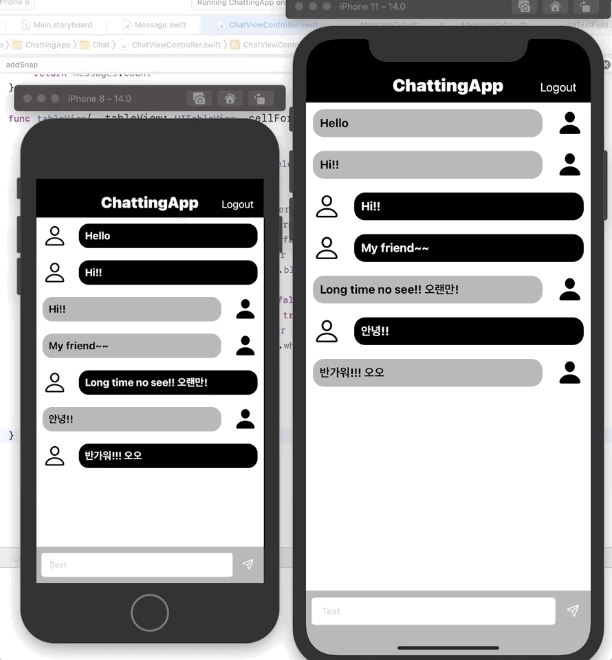 저는 xib파일을 이용해서 만들어주었습니다. 위와 같이 xib를 구성해주었는데 sender가 "나"일 경우 왼쪽 그림을 숨기고, "상대방"일 경우 오른쪽 그림을 숨깁니다.