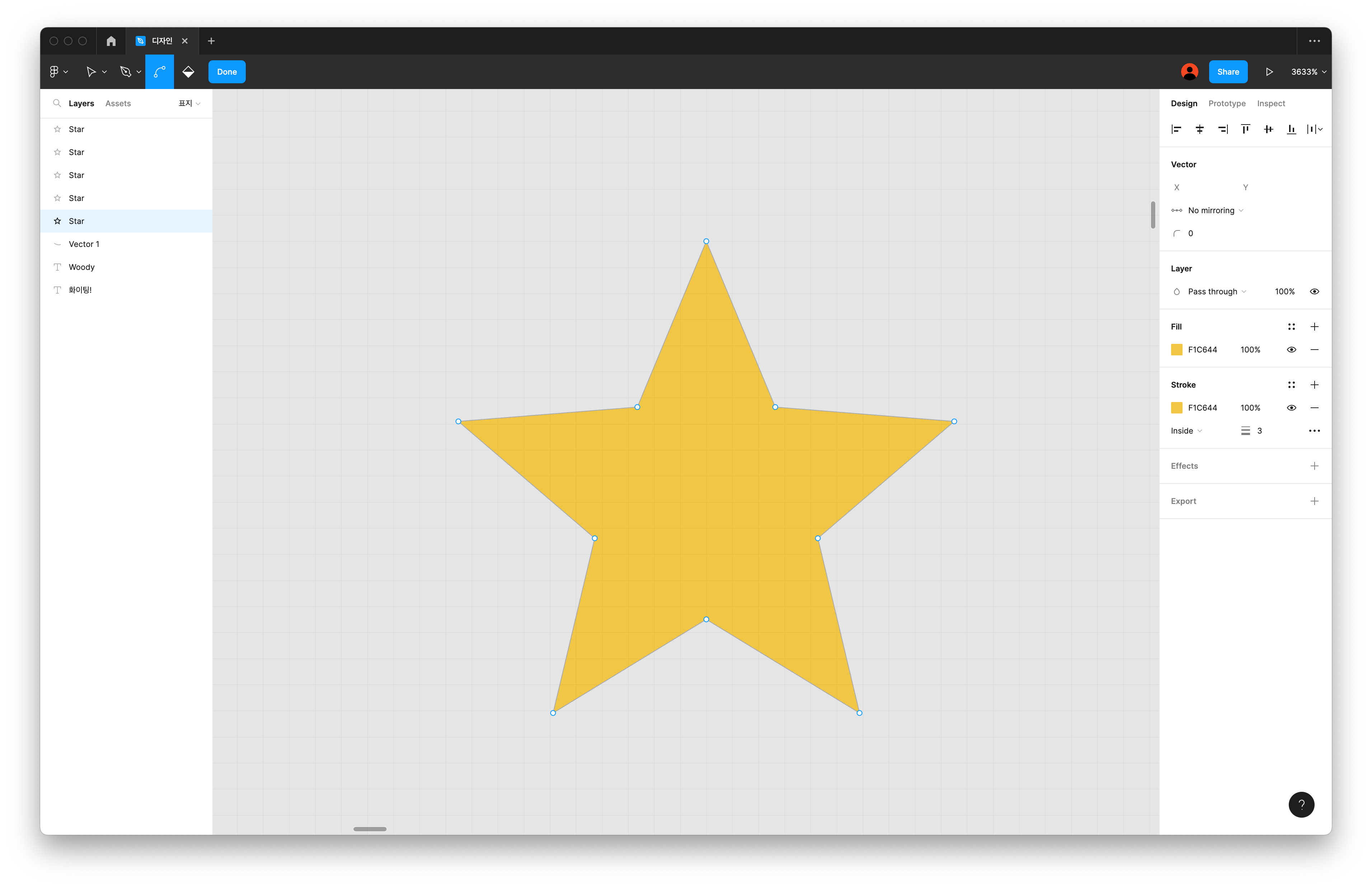 먼저, 저는 밤하늘에 별이 반짝이는 애니메이션을 주고 싶었어요. 그래서 먼저 피그마로 별을 디자인했습니다!